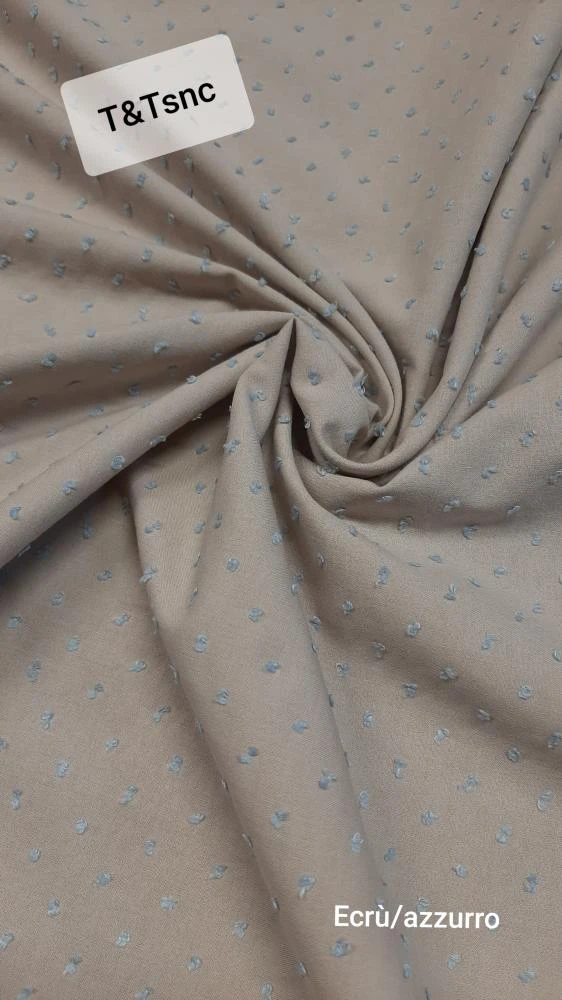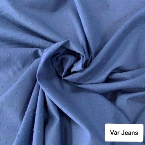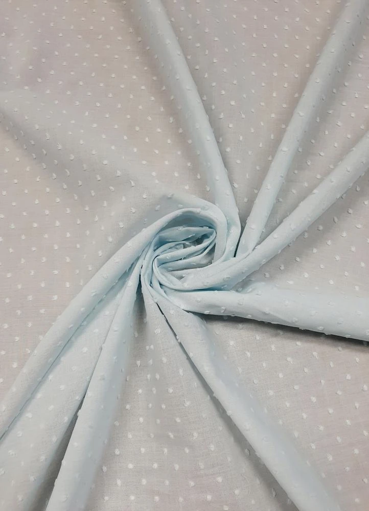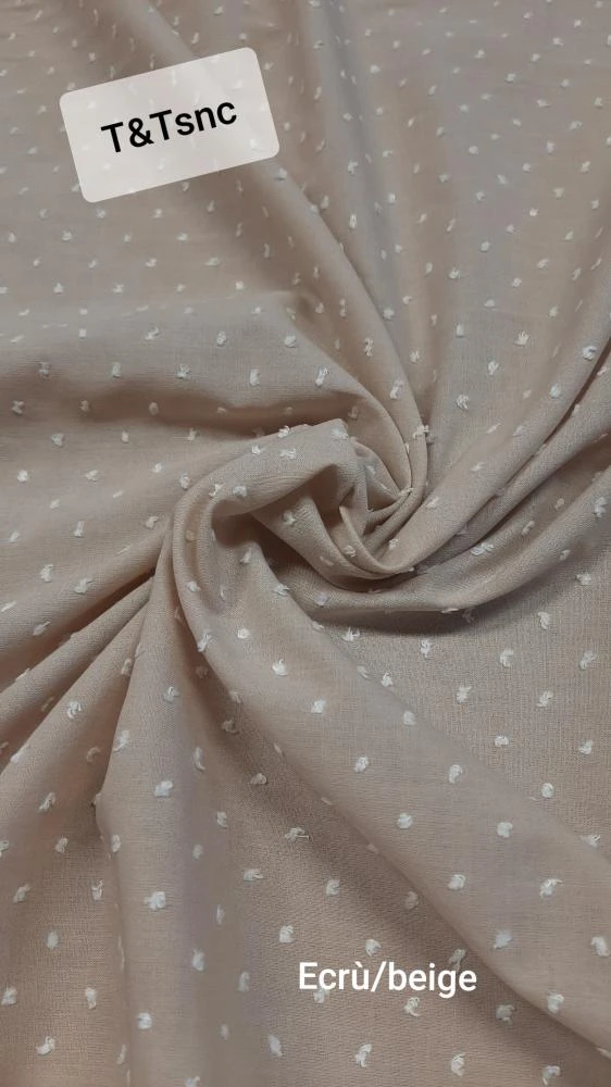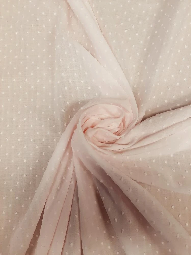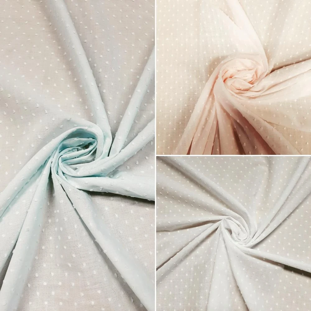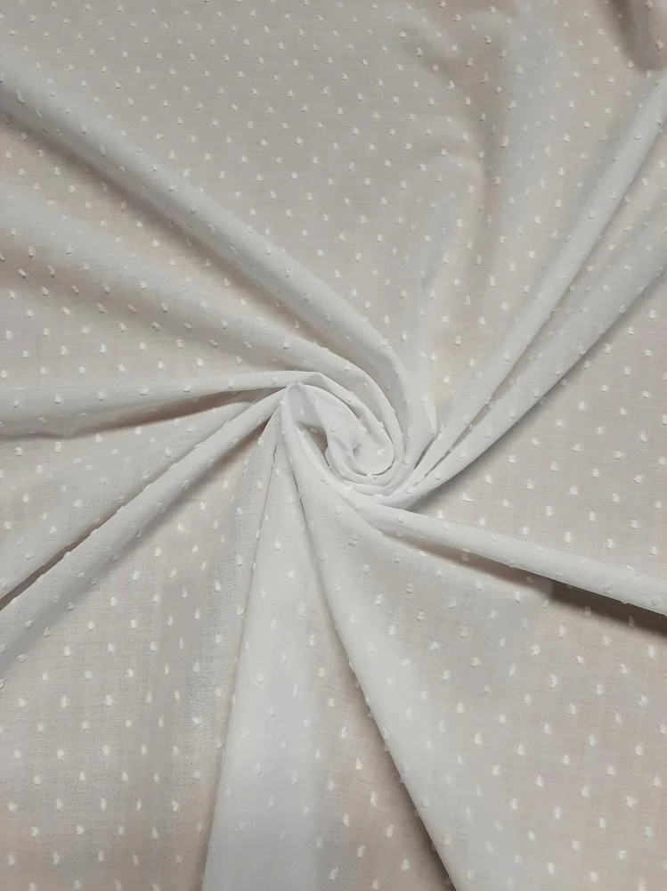 Splendida mussola di cotone 100%, h 150, con inserti ricamati a pois e a rilievo tipici della lavorazione Plumetis.